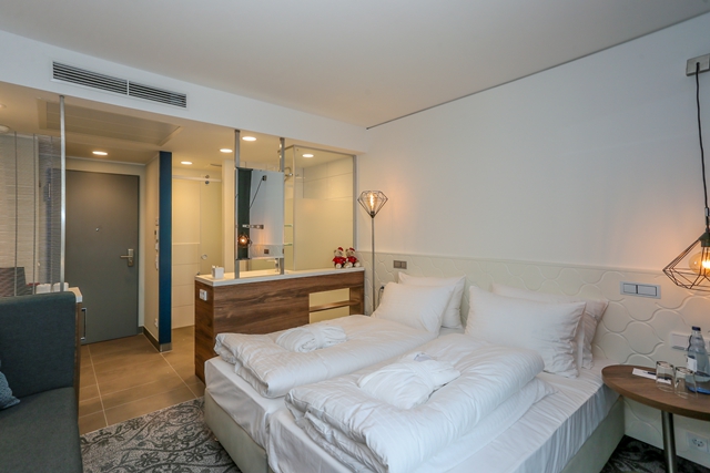 „Der Ansatz aus szeniger Moderne und Art nouveau findet in den 120 Doppelzimmern – inklusive 20 Superior-Zimmern mit Balkon und Blick in den Theodor-Heuss-Park auf elegante Weise seine Fortführung“, teilt Dorint mit. Die Gäste durften auch einen Blick in die Hotelzimmer werfen. Die Räume mit Miniloft-Charakter haben klare Strukturen und sind mit edelem Holzmobiliar sowie neuster Technik wie etwa einer digitalen Gästemappe ausgestattet. Eine Besonderheit stellen die im Zimmer integrierten offenen Baderäume mit freistehendem Waschtisch, abgegrenzt durch eine Milchglasscheibe, dar.