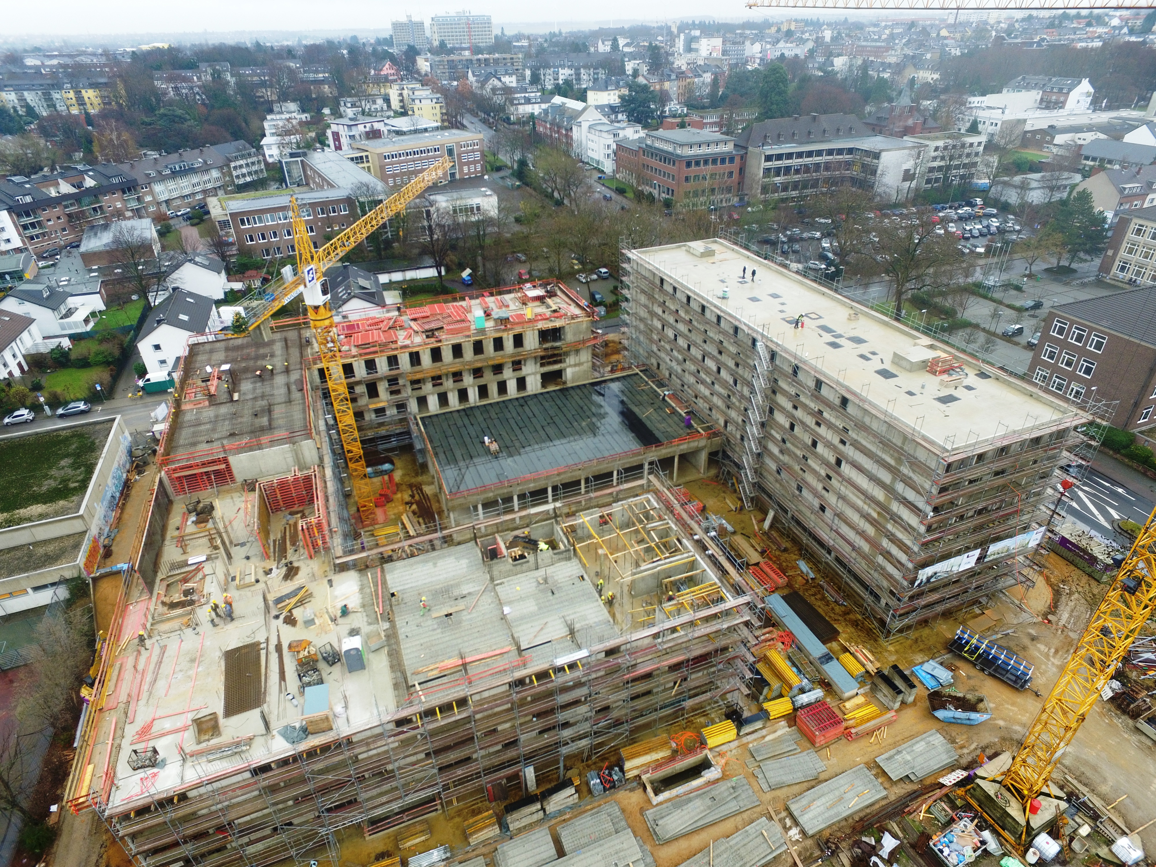 Besondere Aufmerksamkeit verdient jedoch auch die regionale Wertschöpfungskette des Projekts. Als Privatinvestoren konnten Schmiedel und Frühauf auf eine europaweite Ausschreibung verzichten. „Das Auftrags- und Investitionsvolumen von 45 Millionen Euro bleibt zum größten Teil in der Region“, so Schmiedel. So arbeiteten auf der Baustelle nicht nur Subunternehmer aus der Region, auch die Stadtsparkasse Düren sei involviert, und die Stadtwerke Düren werde das gesamte Objekt mit einem hocheffizienten Blockheizkraftwerk energetisch versorgen.