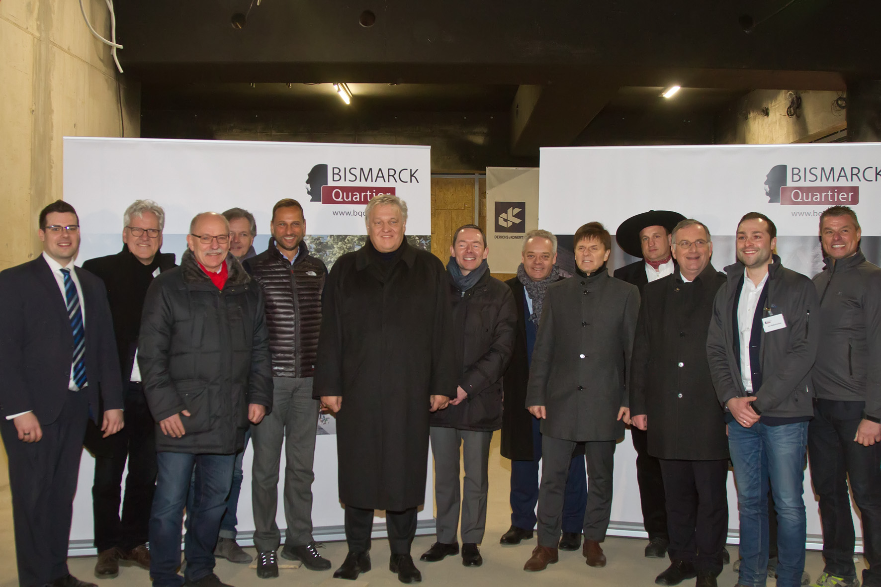 Doch noch mehr Eindruck als diese Daten zur Materialbewegung schindet das Bauvorhaben selber: In Dürens erstem First-Class-Hotel mit modernster Ausstattung, das wie das gesamte Bismarck Quartier vom renommierten Architekturbüro Hentrich-Petschnigg & Partner (HPP) geplant wurde, werden auf sechs Etagen 120 Doppelzimmer errichtet. Ein Restaurant samt Außengastronomie, ein flexibles Konferenzzentrum mit Tagungsmöglichkeiten für bis zu 700 Gästen sowie ein großzügiger Fitnessbereich runden das Angebot ab. Weiterhin entstehen 26 hochwertige Wohneinheiten, darunter fünf Penthäuser, die man mit einem separaten Aufzug direkt aus der Tiefgarage ansteuern kann sowie sechs Gewerbeeinheiten, alles auf einer Gesamtbruttogeschossfläche von über 18.000 Quadratmetern. Auch im Gewerbebereich verzeichnen die Investoren eine enorme Nachfrage, so dass man sich die für das Bismarck Quartier passendsten Gewerbe aussuchen konnte. Georg Schmiedel verriet, dass sich unter anderem ein Sportclub mit angeschlossener Physiotherapie, ein Arzt, ein IT-Profi und ein Jurist dort ansiedeln werden. „Wir haben nur noch eine Einheit frei, also warten Sie nicht mehr zu lange“, riet er scherzend den Gästen und verwies dabei vor allem auf die sich im BQD bietenden Kombinationsmöglichkeiten aus Arbeiten, Wohnen, Konferenzmöglichkeiten, Gastronomie und sportlicher Betätigung unter einem Dach.