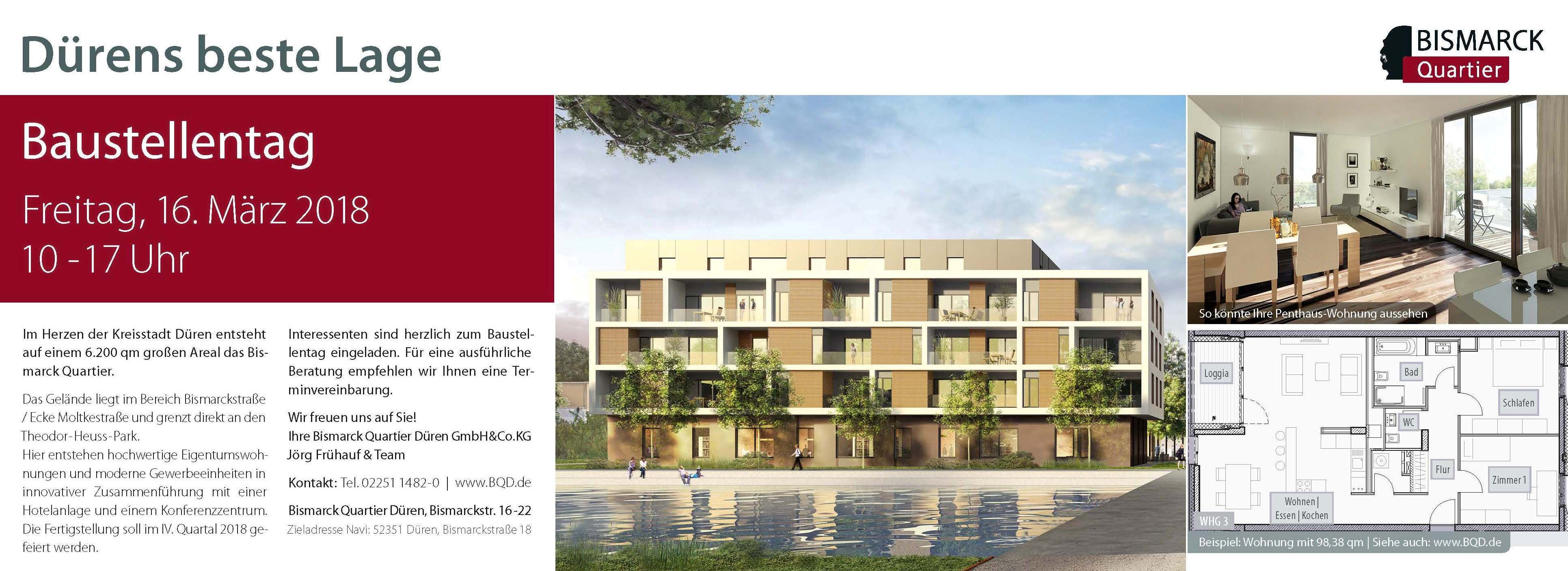 Mehr anzeigenDas Bismarck Quartier Düren (BQD), Leuchtturmprojekt der städtebaulichen Entwicklung in der Kreisstadt, liegt voll im Zeitplan – Hotel soll am 2. November eröffnen – Landrat Spelthahn dankte den beiden Euskirchener Investoren, Georg Schmiedel und Jörg Frühauf, für ihr finanzielles Engagement im Kreis Düren – Auftrags- und Investitionsvolumen von 45 Millionen Euro bleibt zum größten Teil in der Region