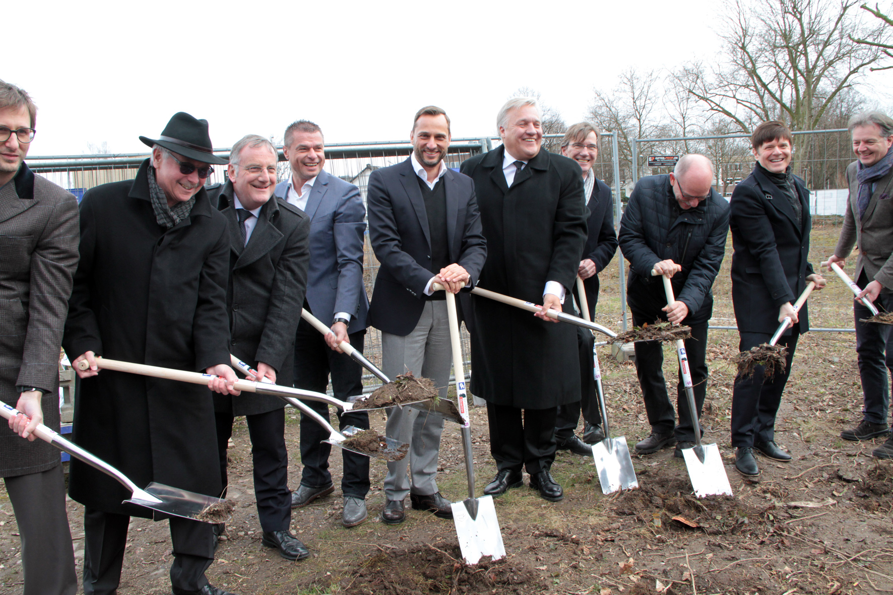 Spatenstich für das neue Bismarck Quartier im Herzen der Kreisstadt – Landrat Wolfgang Spelthahn, die Investoren Georg Schmiedel und Jörg Frühauf sowie Architekt Gerhard Feldmeyer und der Geschäftsführer der Neuen Dorint GmbH, Olaf Mertens, sind vom Erfolg des Projekts überzeugt